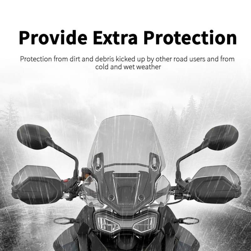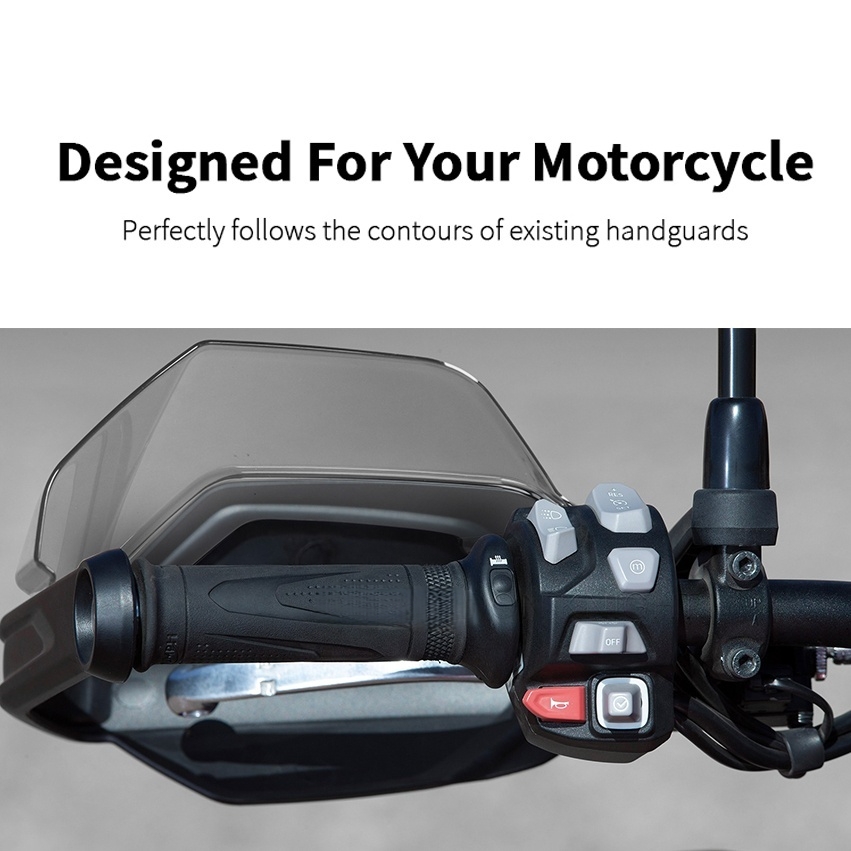 Handguard extensions are specially designed for your motorcycle, perfectly following the contours of your existing handguard. They're made from highly durable PC for extra protection from dirt and debris kicked up by other road users, as well as from cold and wet weather. Our handguard extensions will be safely packaged with comprehensive installation instructions and any other accessories that may be required. No modifications to your motorcycle are required.